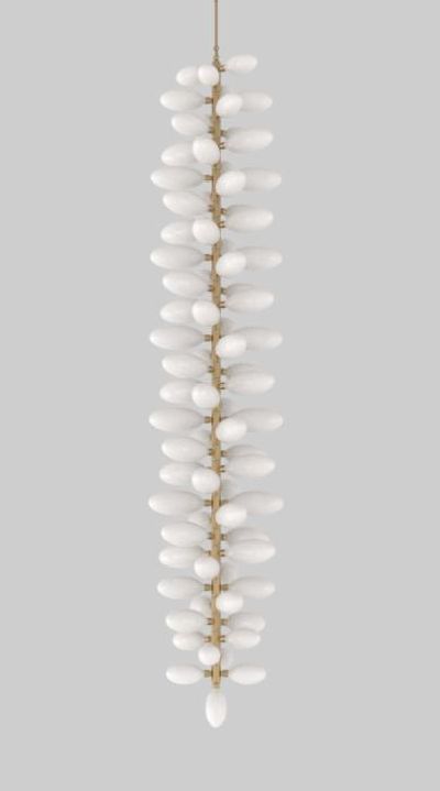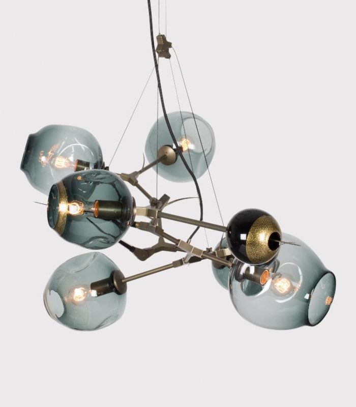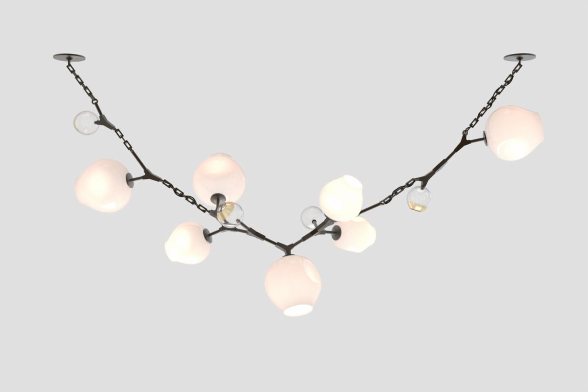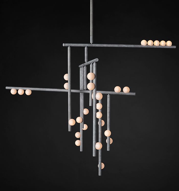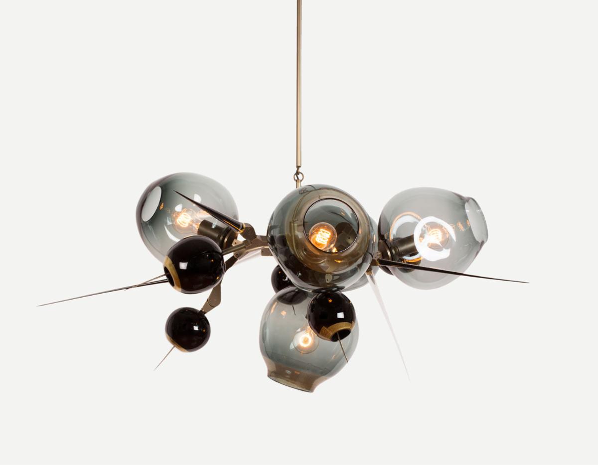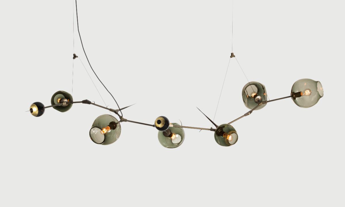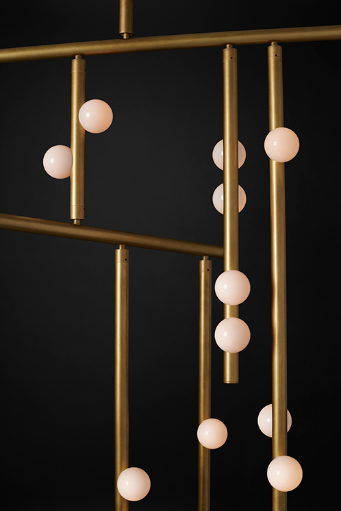 HER WORK IS ICONIC, TRANSFORMING THE EPHEMERAL NATURE OF LIGHT INTO SOMETHING NOT MERELY TANGIBLE, BUT ENDURING. AN ARTISTIC FUSION OF ORGANIC, HANDWROUGHT MATERIALS LIKE BLOWN GLASS WITH THE MANMADE INDUSTRIAL BEAUTY OF MACHINE-MILLED COMPONENTS JUXTAPOSES RADIANT WARMTH WITH DRAMA AND SHADOW.