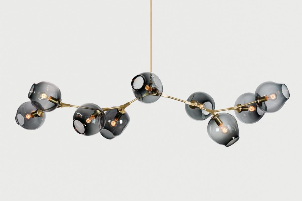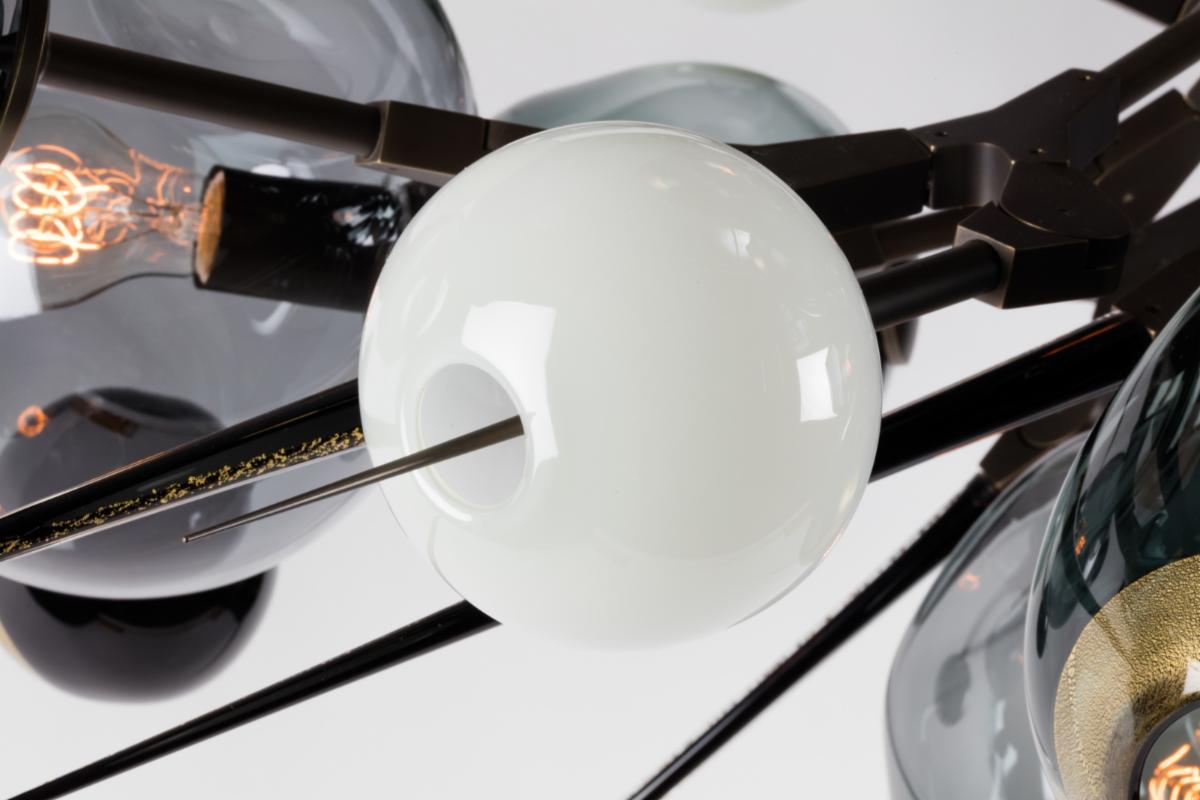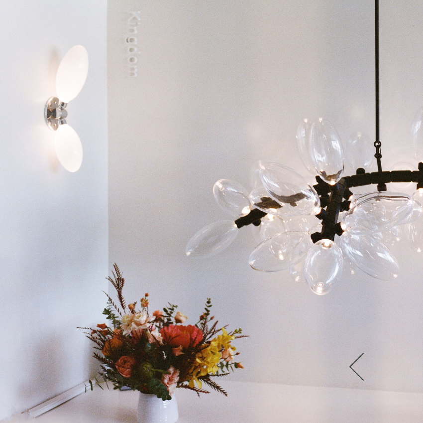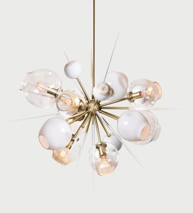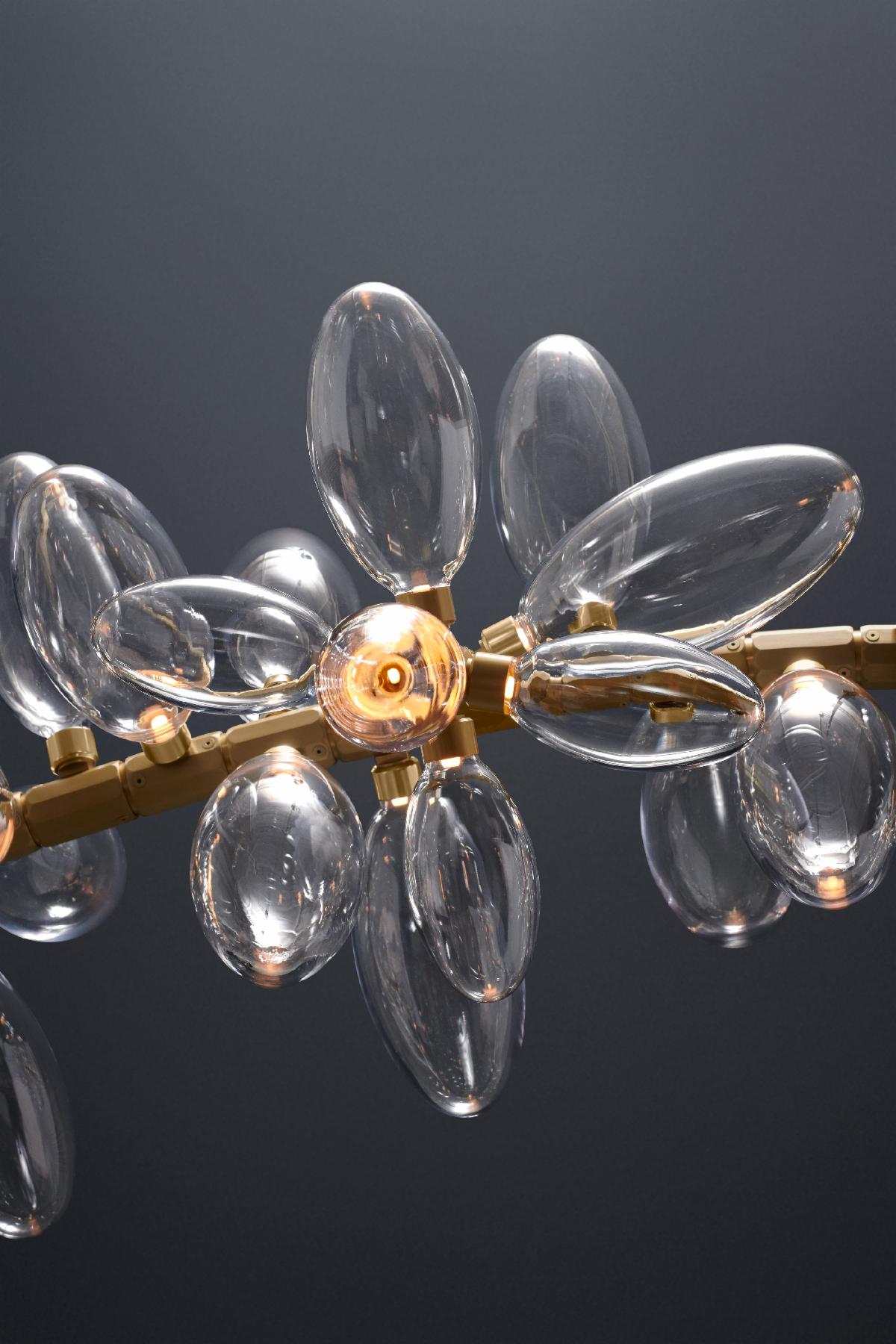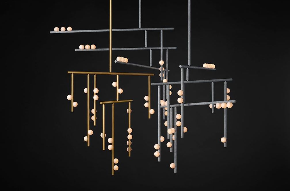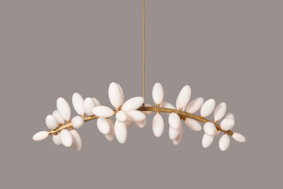 HER WORK IS ICONIC, TRANSFORMING THE EPHEMERAL NATURE OF LIGHT INTO SOMETHING NOT MERELY TANGIBLE, BUT ENDURING. AN ARTISTIC FUSION OF ORGANIC, HANDWROUGHT MATERIALS LIKE BLOWN GLASS WITH THE MANMADE INDUSTRIAL BEAUTY OF MACHINE-MILLED COMPONENTS JUXTAPOSES RADIANT WARMTH WITH DRAMA AND SHADOW.