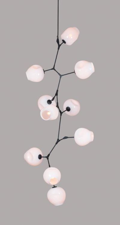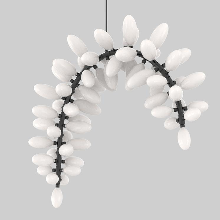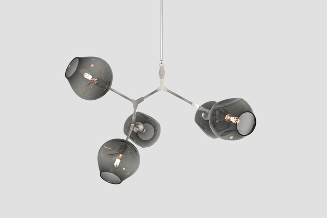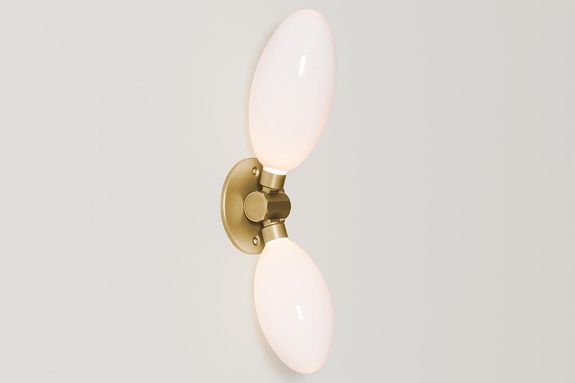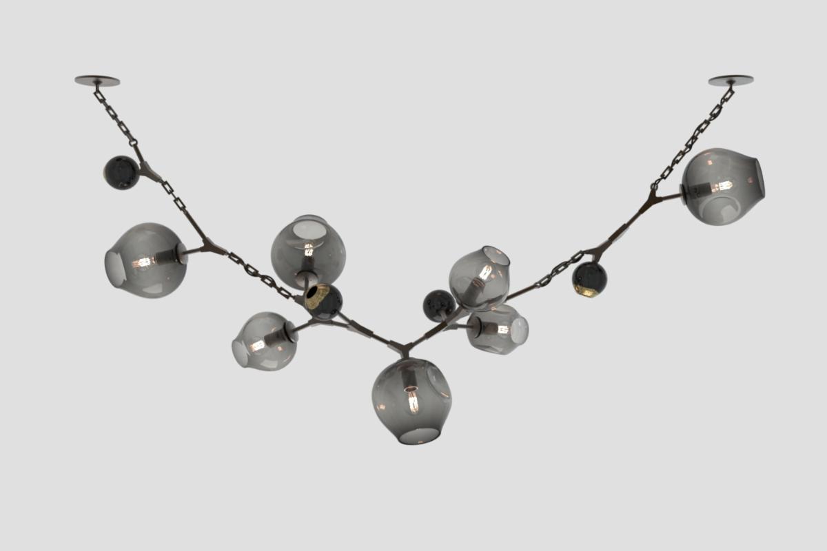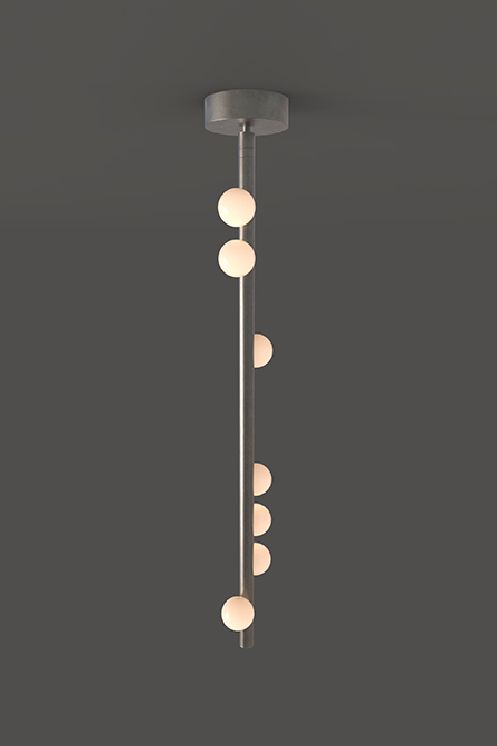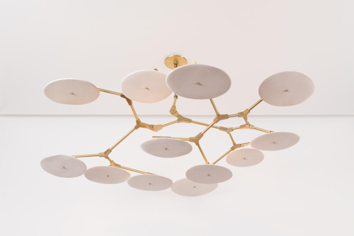 HER WORK IS ICONIC, TRANSFORMING THE EPHEMERAL NATURE OF LIGHT INTO SOMETHING NOT MERELY TANGIBLE, BUT ENDURING. AN ARTISTIC FUSION OF ORGANIC, HANDWROUGHT MATERIALS LIKE BLOWN GLASS WITH THE MANMADE INDUSTRIAL BEAUTY OF MACHINE-MILLED COMPONENTS JUXTAPOSES RADIANT WARMTH WITH DRAMA AND SHADOW.
