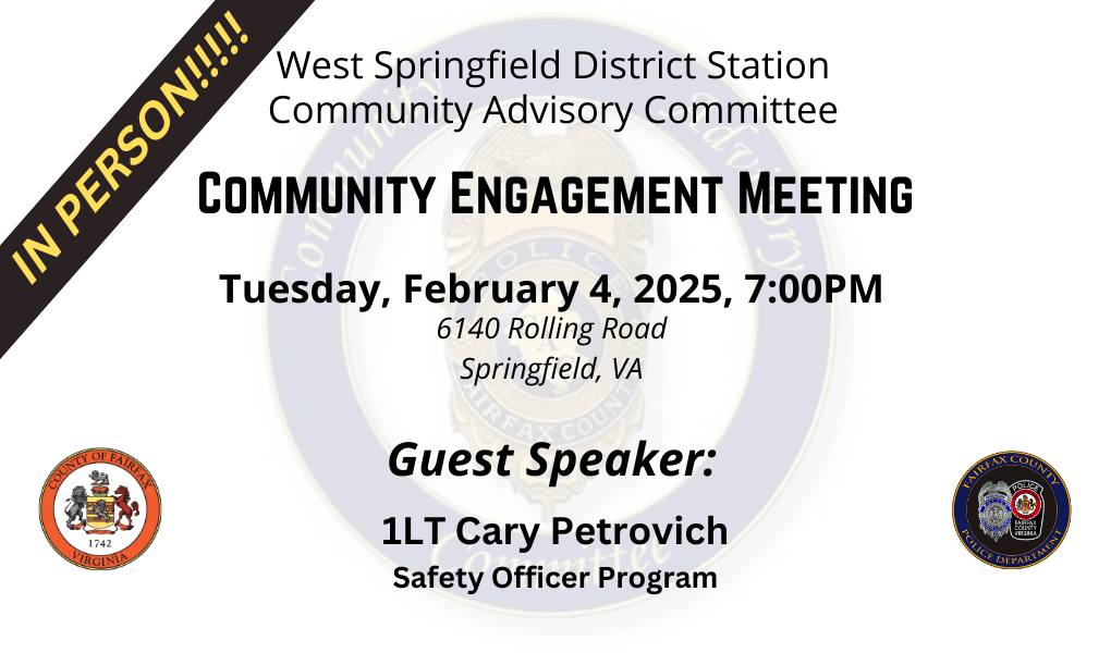 Join the West Springfield District Community Advisory Committee (CAC) for a Community Engagement Meeting on Tuesday, February 4, 2025, at 7:00 PM. These meetings provide an opportunity for community members to connect and communicate directly with officers of the Fairfax County Police Department.