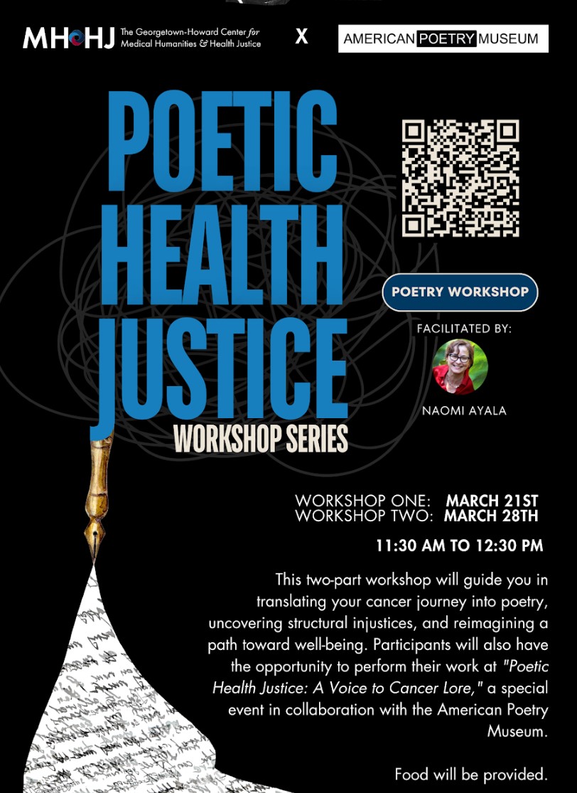 The Georgetown Howard Center for Medical Humanities & Health Justice (MHHJ) and the American Poetry Museum (APM) invite you to participate in the Poetic Health Justice in Cancer Workshop Series!