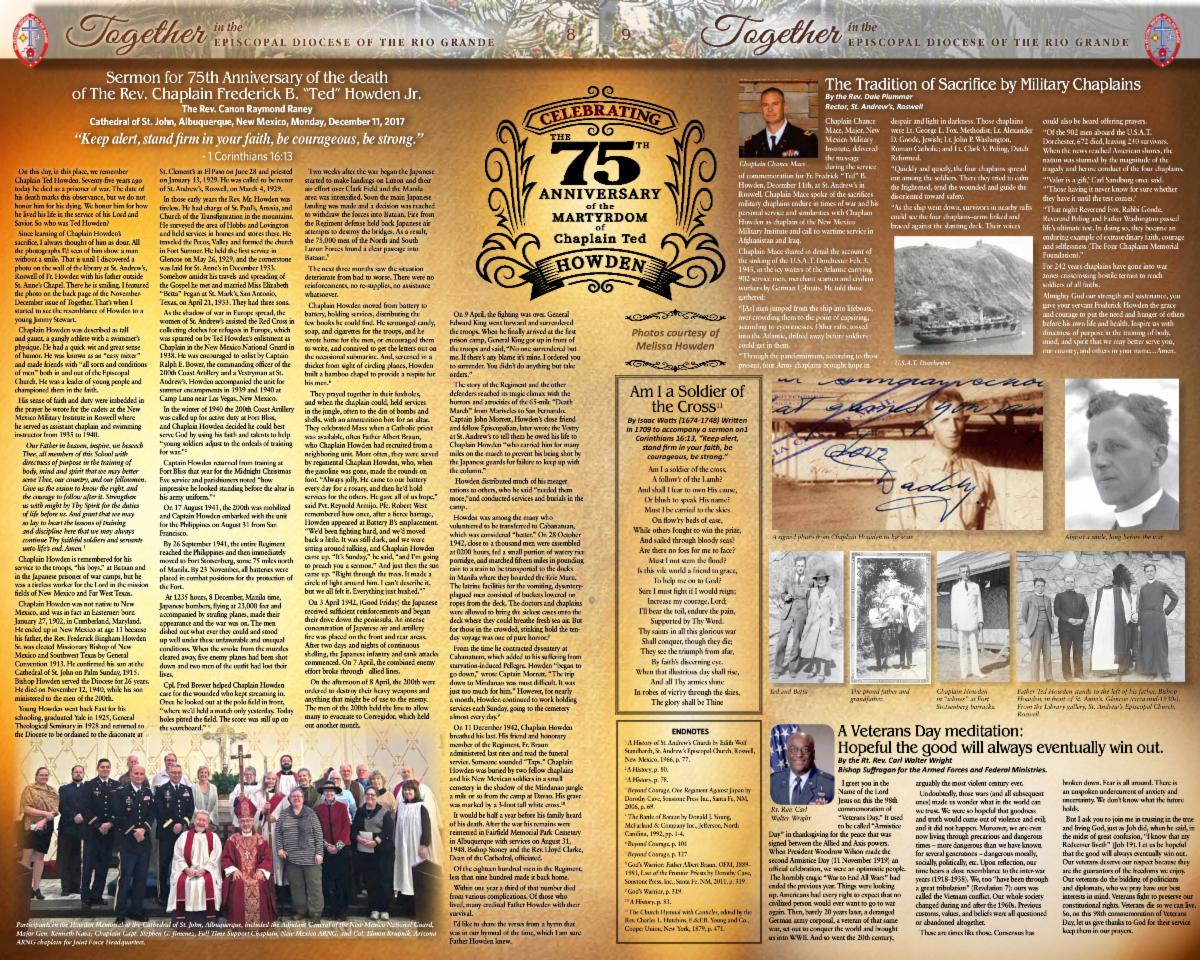 Chaplain Howden was celebrated for many years in his home congregation of St. Andrew’s Episcopal Church, Roswell, New Mexico. In 2000 the Annual Diocesan Convention established December 11 to commemorate Fr. Howden in the liturgical calendar of the Diocese of the Rio Grande. In 2012 Bishop Michael Vono instituted the first diocesan-wide observance of Fr. Howden’s feast day with services in each of the four deaneries on December 11. Diocesan observances have occurred each year since 2012.