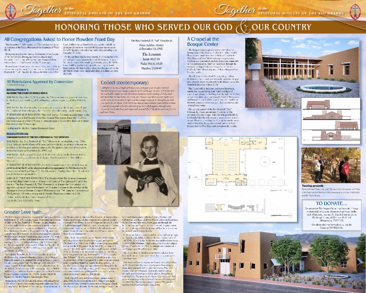 The 2018 General Convention of the Episcopal Church considered resolutions from the Diocese of the Rio Grande, the Deputation of the Diocese of the Rio Grande and the Bishop of the Diocese of the Rio Grande to designate December 11 to honor Bataan Martyr and Chaplain the Rev’d Frederick B. “Ted” Howden Jr. and add his name to Lesser Feasts and Fasts. The resolutions were forwarded to the Standing Committee on Liturgy and Music for consideration. The resolutions were supported by the former and current Bishops of the Armed Forces and Federal Ministries as well as other Deputations, Dioceses and Bishops.