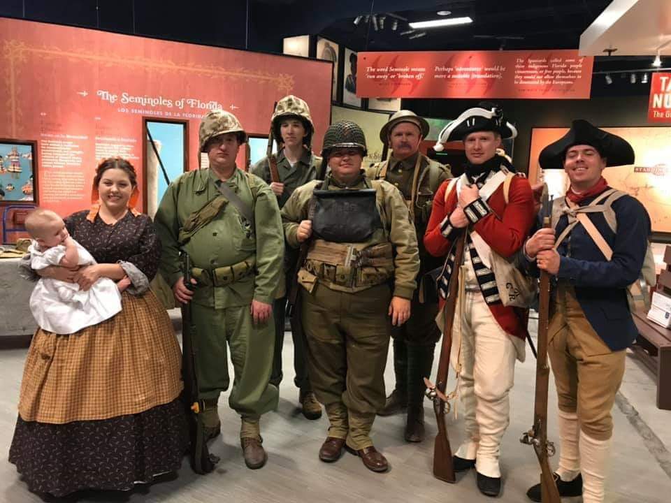 The main museum opened in January 2009, with Ross hired to work both in the Facility department and as a historical interpreter, a challenging and vital combination of two different tasks. Working with the various departments, particularly the Education and Marketing departments. The day-to-day operation of programs for living history include school tours, special groups, and holiday programs, particularly the popular military timeline program for 4th of July. This annual program includes reenactors of various Florida history going back from 16th century Spanish Colonial times up to Vietnam, with a proud partnership with local individual reenactors and the Liberty Guards Mess, an independent progressive group of quality young reenactors doing multiple periods but specializing in Revolutionary War and Civil War.