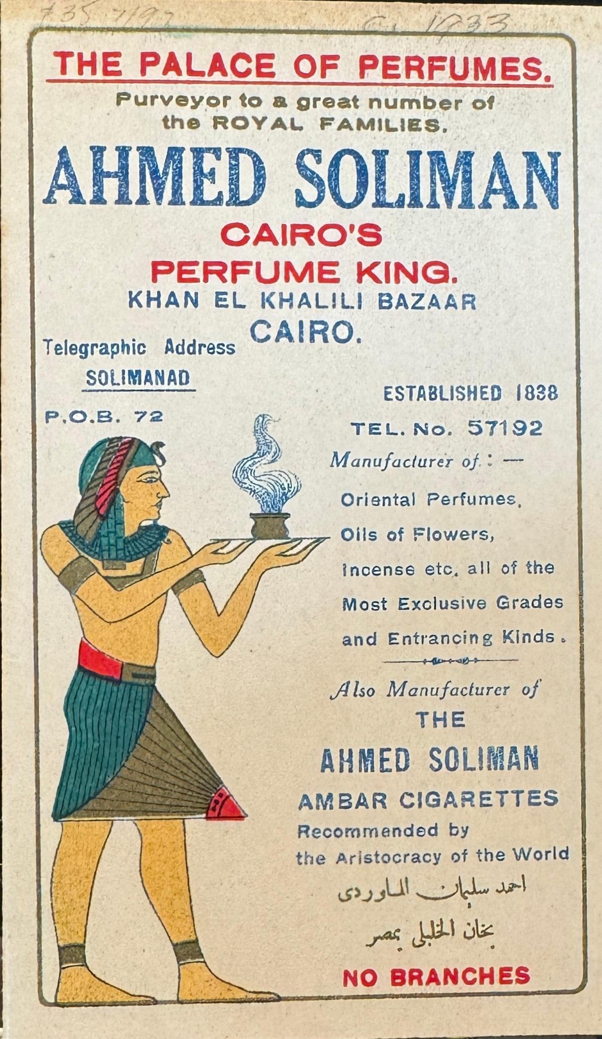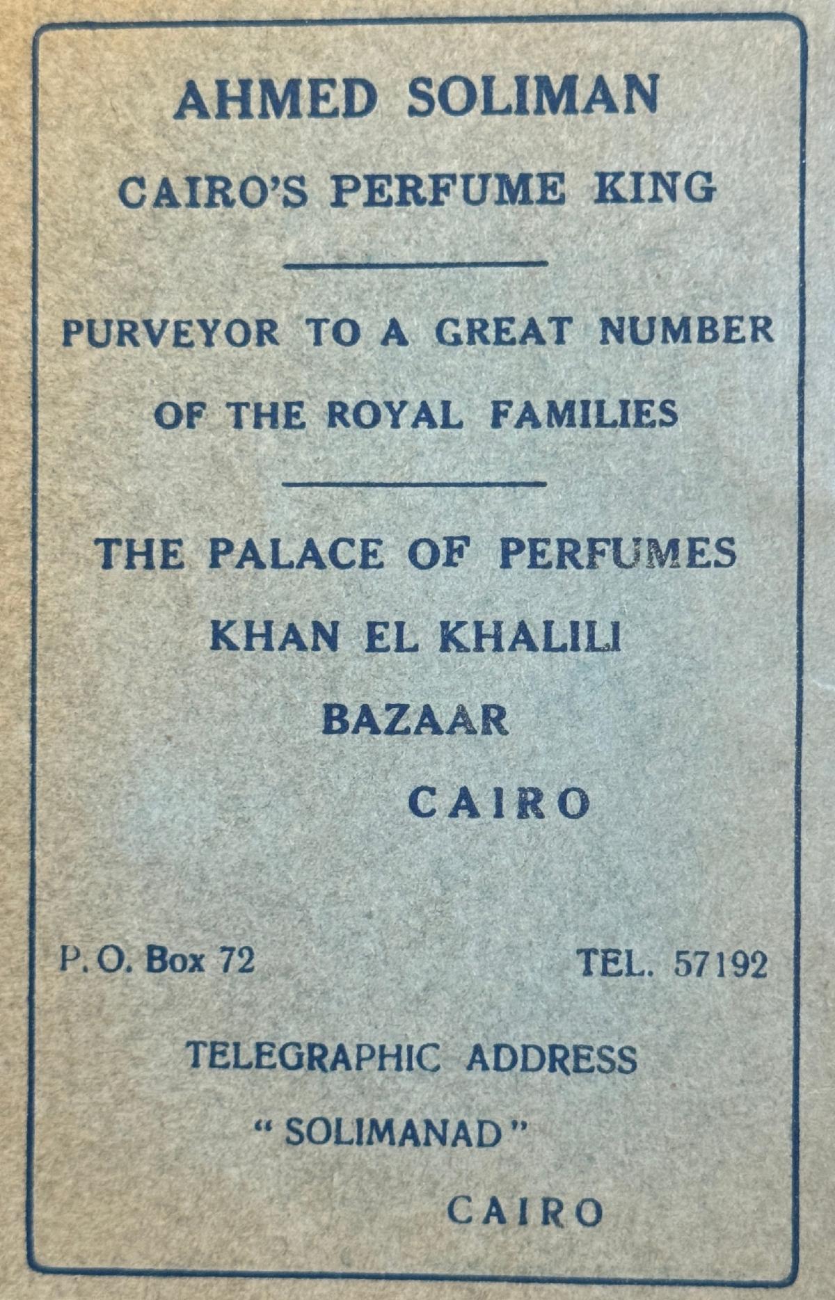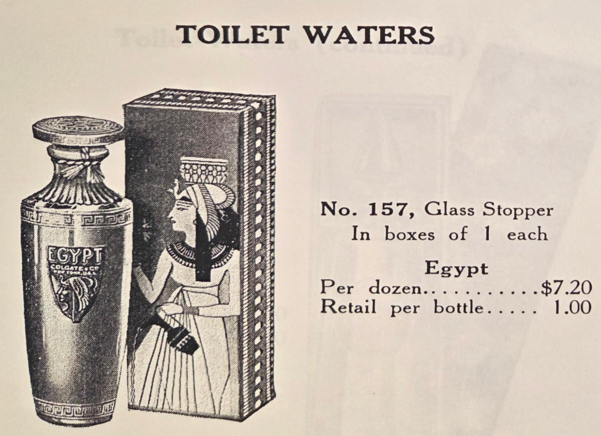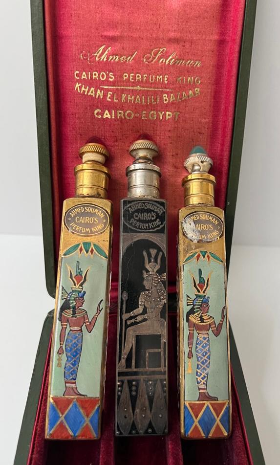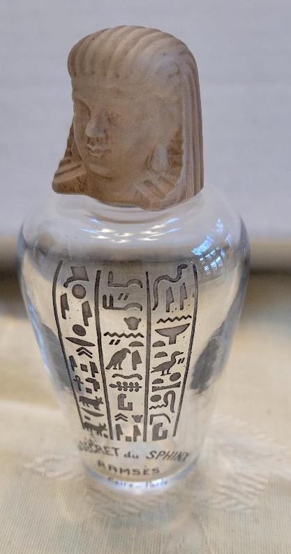 | | Robj made this kneeling 8" Egyptian woman perfume lamp in the 1920s. It's stamped Robj and Made in Paris on the bottom. It's included in the Robj display in the Deco gallery. | | Two fun ladies compacts with Egyptian motifs from the 1920s! The 6-1/2" celluloid vanity (below) includes an Egyptian figure on the front. Inside has a mirror and powder and rouge areas. There is a lipstick hidden in the tassel. | | The round enamel powder compact (below) has an Egyptian figure on the lid. Inside is a mirror and area for powder. It measures 1-1/4" around and it can hang on a chain to wear it. | | This brassy powder tin includes a mirror inside. It's also embossed ""Cleopatra Vanity Box Co., Pat. July 5th 1910, New York," on the inside. It measures 2" around. | | These two clear odd shaped perfume bottles feature red etched Egyptian figures. The pointed caps lift off to reveal the stopper. No identification on the bottles, and the research on these unusual perfumes is an ongoing project at Perfume Passage! | | Ahmed Soliman (1906-1956) owned a perfumery in the Khan-Khalili Bazaar in Cairo, Egypt during the first half of the 20th century. He marketed himself as "Cairo's Perfume King" in his promotional materials and claimed to have clients from around the world, including many Royal family members. His shop also sold incense and kohl in addition to a variety of fragrances. | | This beautiful cut glass perfume bottle measures 6" tall and the sterling stopper is in the shape of a pharoah's head! | This milk glass triangular-shaped powder box was made by Detroit's Agra Parfumeur company for their Nysis face powder. It dates from the 1920s. | We’re thrilled when we stumble upon paper items featuring Egyptian motifs, as it perfectly aligns with our passion for ephemera at Perfume Passage! | A 1927 Colgate catalog featured toilet waters with an Egyptian image on the bottle and box. Not a bad price at $7.20 per dozen! | | | | Ramses Le Secret du Sphinx was a fragrance for women released in 1917. The clear glass Baccarat bottle has Egyptian symbols etched on the front. | | The Hart-Albin Company, an iconic department store in Billings, Montana opened its doors in 1902 and operated until 1990. They were a retail business in the heart of downtown and a shopping haven for many. Just take a look at this fantastic April 20, 1923 advertisement, offering some of the most now sought-after Egyptian perfumes today! Among those for sale were Perfume Passage favorites including Secret du Sphinx, Sphinx d'Or and Ramses IV. Each sold for $3.50 an ounce, that's about $66.30 today! | | This 3" clear glass Ramses Sphinx D'Or bottle has a frosted blue glass stopper in the shape of a sphinx. It was made by Julien Viard in 1919. | | This beautiful 4.75" Rames IV Baccarat perfume bottle was made by Julien Viard in 1919. | | |