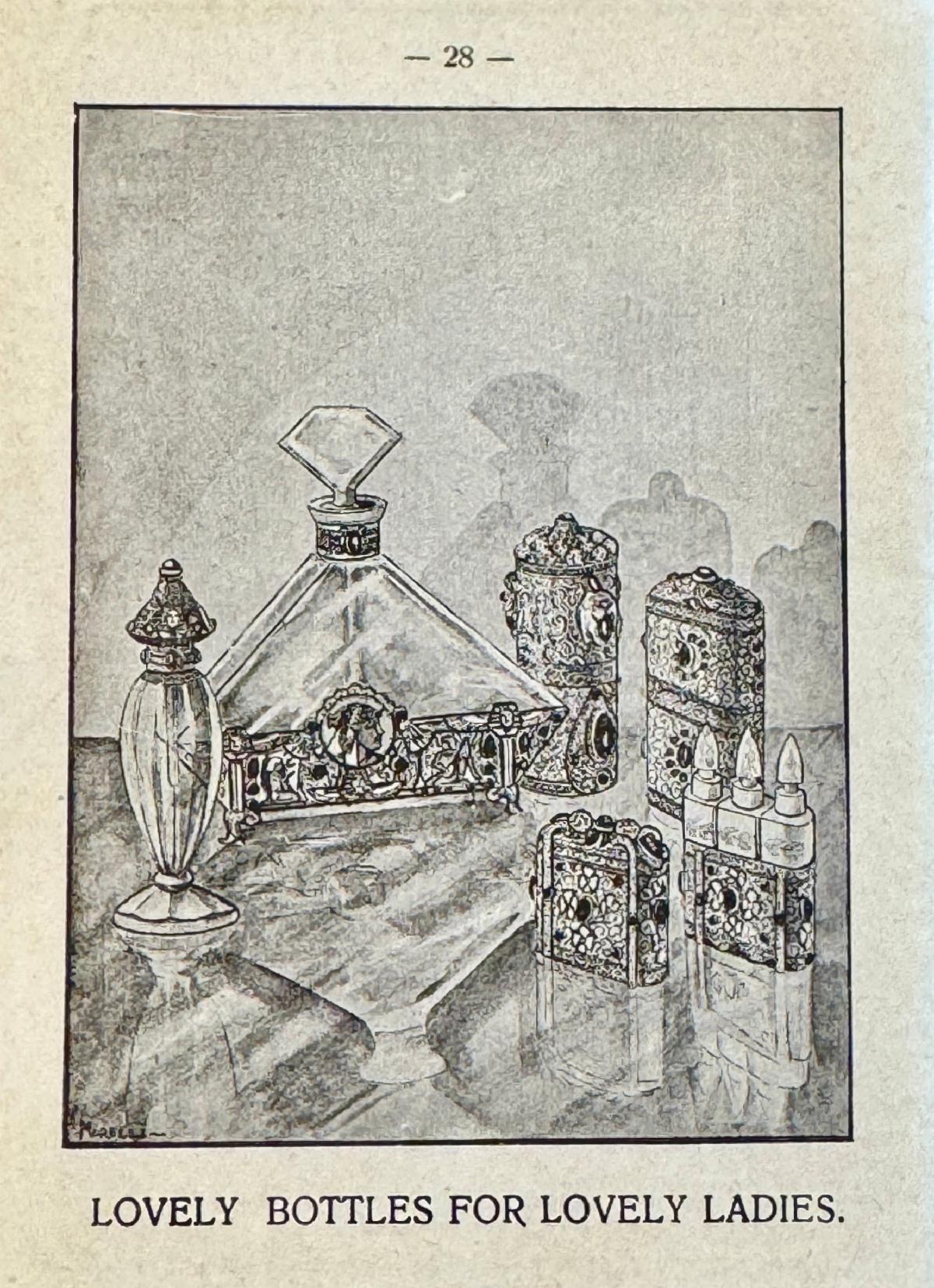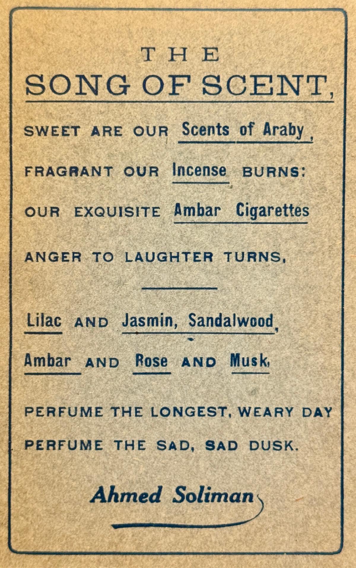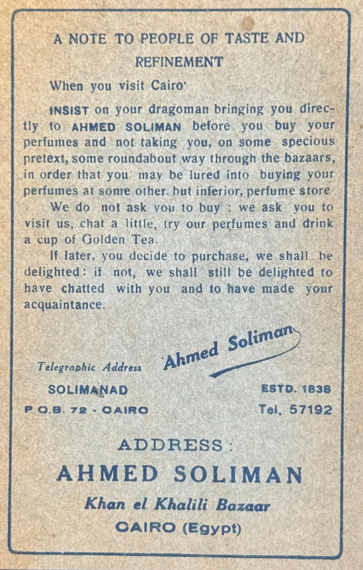 | | Robj made this kneeling 8" Egyptian woman perfume lamp in the 1920s. It's stamped Robj and Made in Paris on the bottom. It's included in the Robj display in the Deco gallery. | | Two fun ladies compacts with Egyptian motifs from the 1920s! The 6-1/2" celluloid vanity (below) includes an Egyptian figure on the front. Inside has a mirror and powder and rouge areas. There is a lipstick hidden in the tassel. | | The round enamel powder compact (below) has an Egyptian figure on the lid. Inside is a mirror and area for powder. It measures 1-1/4" around and it can hang on a chain to wear it. | | This brassy powder tin includes a mirror inside. It's also embossed ""Cleopatra Vanity Box Co., Pat. July 5th 1910, New York," on the inside. It measures 2" around. | | These two clear odd shaped perfume bottles feature red etched Egyptian figures. The pointed caps lift off to reveal the stopper. No identification on the bottles, and the research on these unusual perfumes is an ongoing project at Perfume Passage! | | Ahmed Soliman (1906-1956) owned a perfumery in the Khan-Khalili Bazaar in Cairo, Egypt during the first half of the 20th century. He marketed himself as "Cairo's Perfume King" in his promotional materials and claimed to have clients from around the world, including many Royal family members. His shop also sold incense and kohl in addition to a variety of fragrances. | | This beautiful cut glass perfume bottle measures 6" tall and the sterling stopper is in the shape of a pharoah's head! | This milk glass triangular-shaped powder box was made by Detroit's Agra Parfumeur company for their Nysis face powder. It dates from the 1920s. | We’re thrilled when we stumble upon paper items featuring Egyptian motifs, as it perfectly aligns with our passion for ephemera at Perfume Passage! | A 1927 Colgate catalog featured toilet waters with an Egyptian image on the bottle and box. Not a bad price at $7.20 per dozen! | | | | Ramses Le Secret du Sphinx was a fragrance for women released in 1917. The clear glass Baccarat bottle has Egyptian symbols etched on the front. | | The Hart-Albin Company, an iconic department store in Billings, Montana opened its doors in 1902 and operated until 1990. They were a retail business in the heart of downtown and a shopping haven for many. Just take a look at this fantastic April 20, 1923 advertisement, offering some of the most now sought-after Egyptian perfumes today! Among those for sale were Perfume Passage favorites including Secret du Sphinx, Sphinx d'Or and Ramses IV. Each sold for $3.50 an ounce, that's about $66.30 today! | | This 3" clear glass Ramses Sphinx D'Or bottle has a frosted blue glass stopper in the shape of a sphinx. It was made by Julien Viard in 1919. | | This beautiful 4.75" Rames IV Baccarat perfume bottle was made by Julien Viard in 1919. | | |