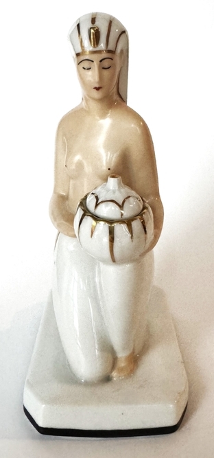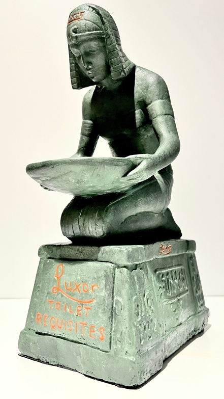 This 1912 chalkware display is of an Egyptian woman holding a bowl. She is kneeling on a rectangular-shaped base that includes hieroglyphics.