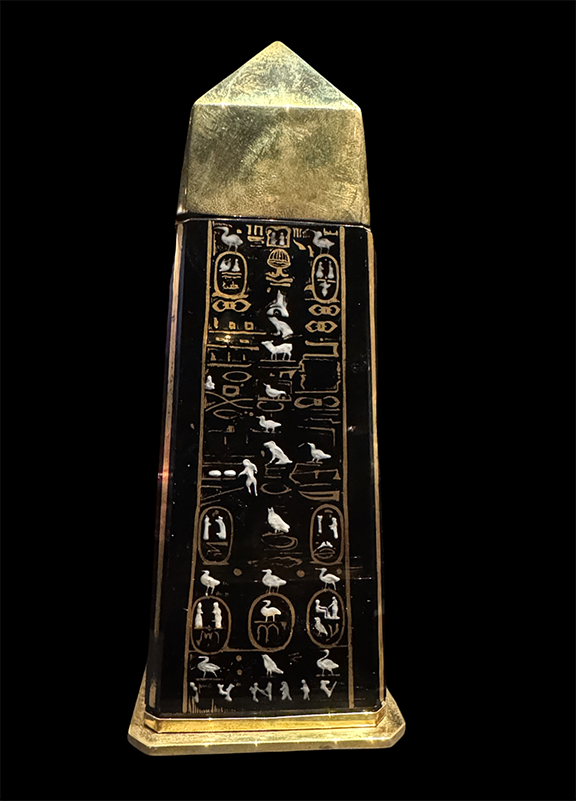 This 8" x 3" Lune Sur Le Nil (Full Moon on the Nile) black crystal perfume bottle was produced by Parfums de Burmann in 1934. The obelisk-shaped bottle has a gilded brass base and cap with enameled hieroglyphics and decorative motifs on the front and two gold foil labels on the back.
