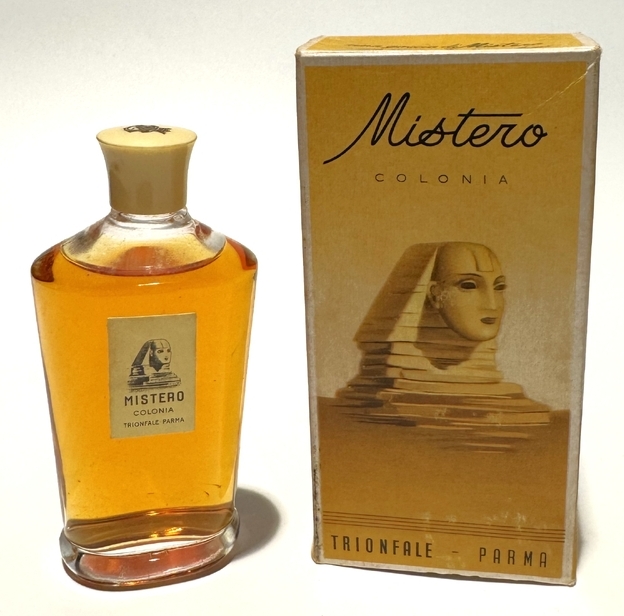 Mistero by Triofale (above) is a fragrance for women, launched in 1950. The 4" bottle came in a decorative box with a pharaoh image on the front.
