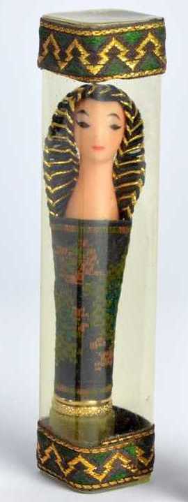 The Sphinx lipstick doll had a label with the name. Its issue was timed with the release of the 1963 movie Cleopatra, starring Elizabeth Taylor. The lipstick had nothing to do with Cleopatra's love triangle with Julius Caesar and Marc Antony as she tried to save the Egyptian empire. However, the film inspired Egyptian themed clothing lines, home accessories and makeup trends. Revlon's Sphinx lipstick doll is one of their most popular dolls.