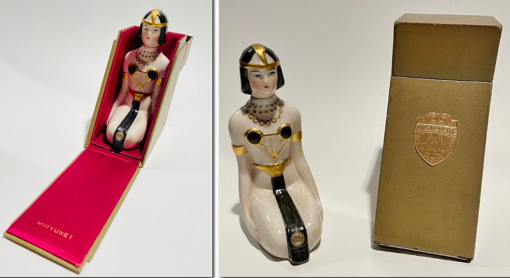 | | Julien Viard designed this 6" Modernis flask-shaped perfume bottle with a Egyptian scarab stopper for Caron in 1913. | | The Fulper Pottery Works company issued this 5" x 2" Minyunet Mignonette glazed porcelain Egyptian woman perfume bottle in the 1920s. It comes with the original box. | | |