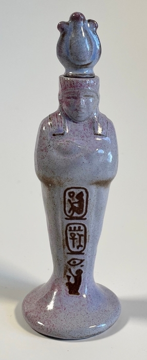 The Marblehead Pottery company made this 1927 perfume bottle. The 5" bottle is in the shape of a mummy and has Egyptian hieroglyphics down the front and back.