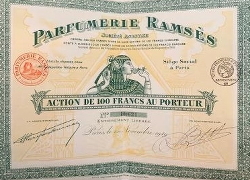 The older perfume and cosmetic stock certificates, such as the above 1919 Ramses certificate, are often printed in color with company buildings, addresses and logos, providing insight to a company's history. The vintage stock certificates in the Perfume Passage collection have been canceled and do not have any investment value, but they are the real deal!