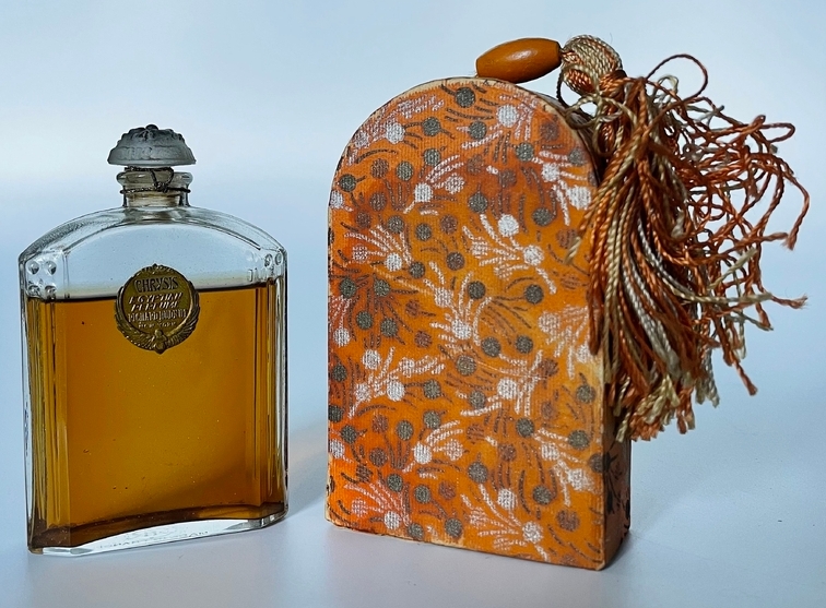 | | Chrysis Egyptian Perfume by RIchard Hudnut (above) features an Egyptian falcon with outstretched wings on the label. The embossed gold foil label reads "Chrysis Egyptian Perfume." The small 3" bottle has ribbed sides and a floral grey patina glass stopper. The bottle has an acid etched Made in France with the Hudnut logo on the bottom. It comes in a beautiful silver, black and orange box that has an orange and white tassel. The Chrysis fragrance for women was introduced in 1904. Hudnut also used this bottle and box presentation for several of their other fragrances. | | |
