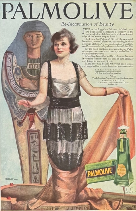 A beautiful ad for Palmolive soap and Palm Oil from the 1920s features an Egyptian mummy to assist in selling the products!