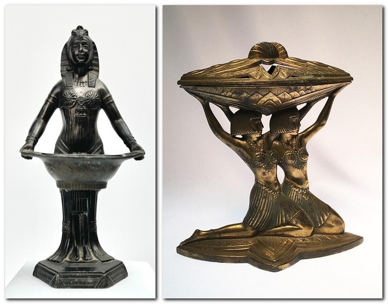The 7" x 6" Vantine's incense burner (right) shows two Egyptian women holding a basket above their heads. It's marked with the model number 1286, Vantine's and Made in France on the bottom. Both date from the 1920s.