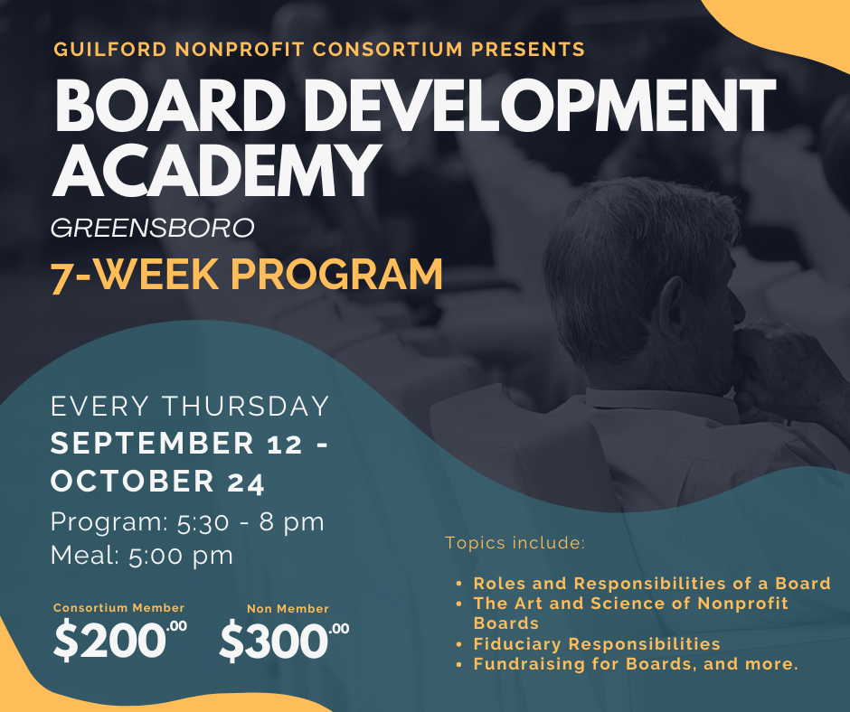 Board Development Academy (Greensboro). The Board Development Academy, a seven-week program offered through the Guilford Nonprofit Consortium, is designed to meet the needs of new, prospective, and existing nonprofit board members to help maximize their impact in serving our community. Participants in the seven-week program focus on relevant topics related to board service that can be put to immediate use.