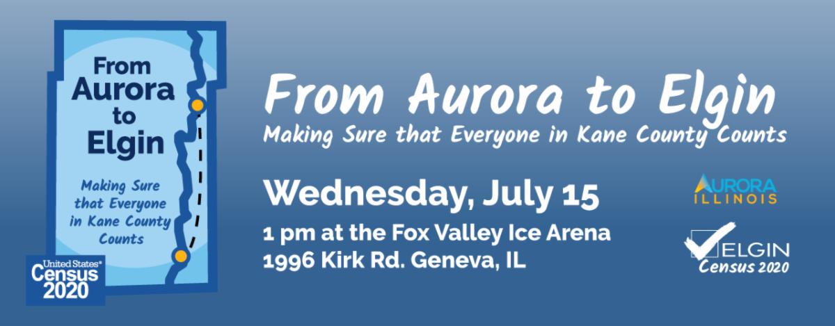 After both cities' local activities, all caravan participants will come together at 1 pm for music and surprises at the Fox Valley Ice Arena, 1996 S. Kirk Road, Geneva. (The rain date for the event is July 17.) Aurora Mayor Richard Irvin and Elgin Mayor David Kaptain are scheduled to talk about the importance of the Census. Please click here to watch
