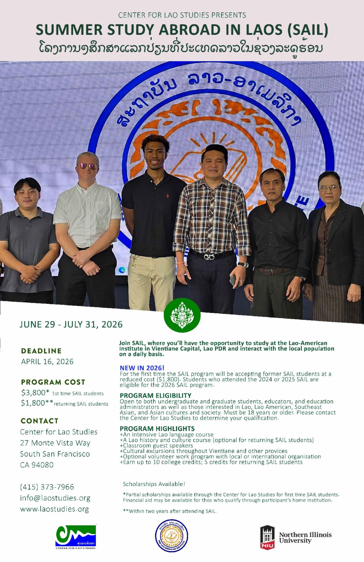 Applications are now available for our 2026 summer SAIL program. The program is open to undergraduate and graduate students, educators, and administrators interested in Lao culture and identity. New this year is that the program is also open to those who have attended previously, with reduced tuition for returning students. The deadline to apply is April 16, 2026.