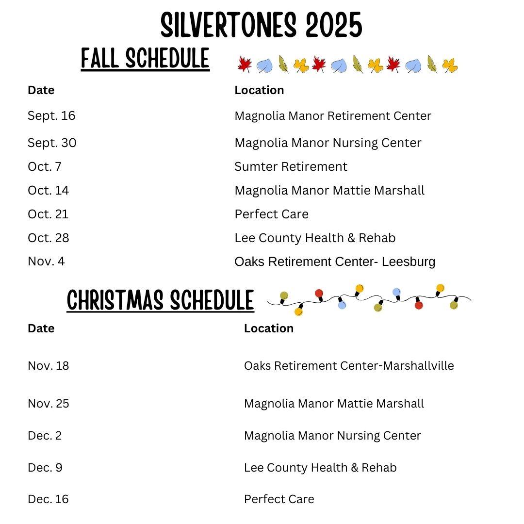 There will be no Silvertones on Tuesday, September 23rd. We will resume on September 30th when we are scheduled to sing at the Magnolia Manor Nursing Center.