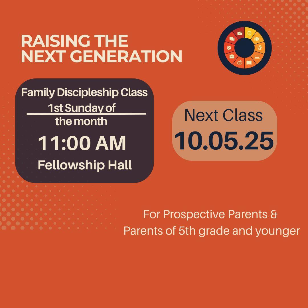 Our next Parent Discipleship Class is scheduled for Sunday, October 5th at 11:00 am in the Fellowship Hall. This class is for prospective parents and parents of children aged 5th grade and below. We meet once a month and we would be happy to have you join us! For more information, please see Elliott or Ellis Coffee.