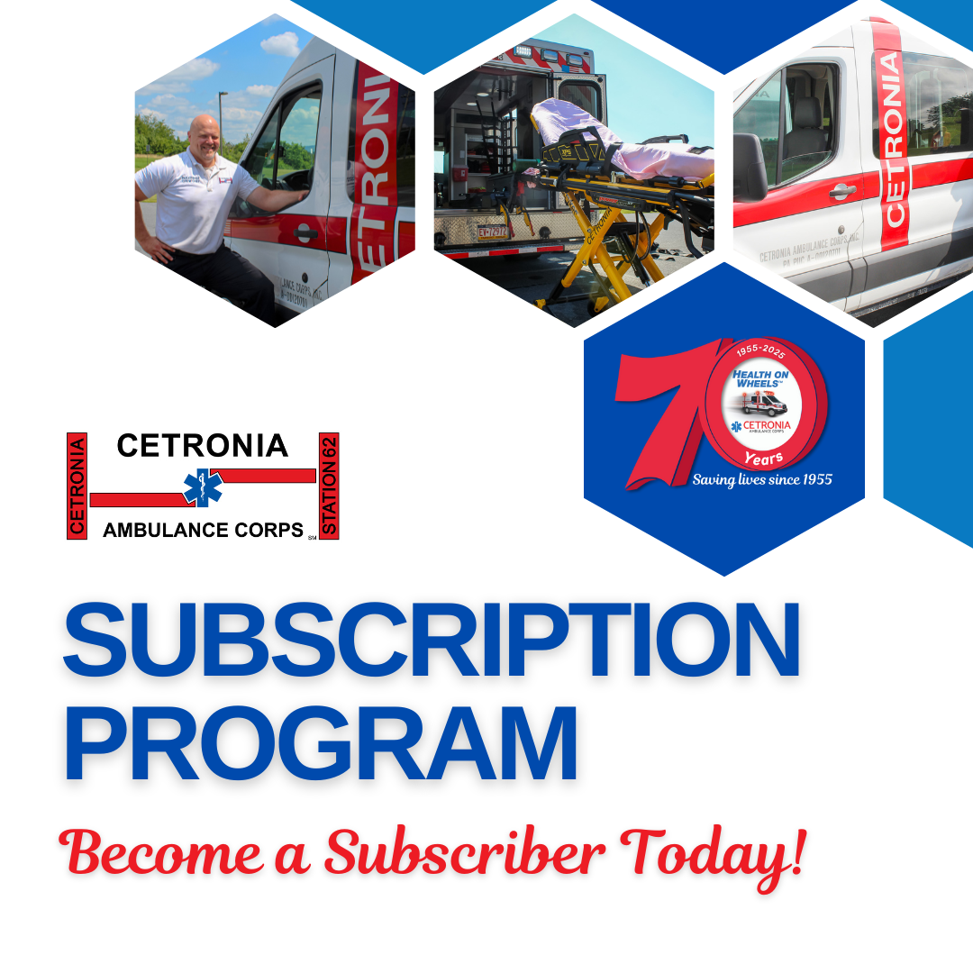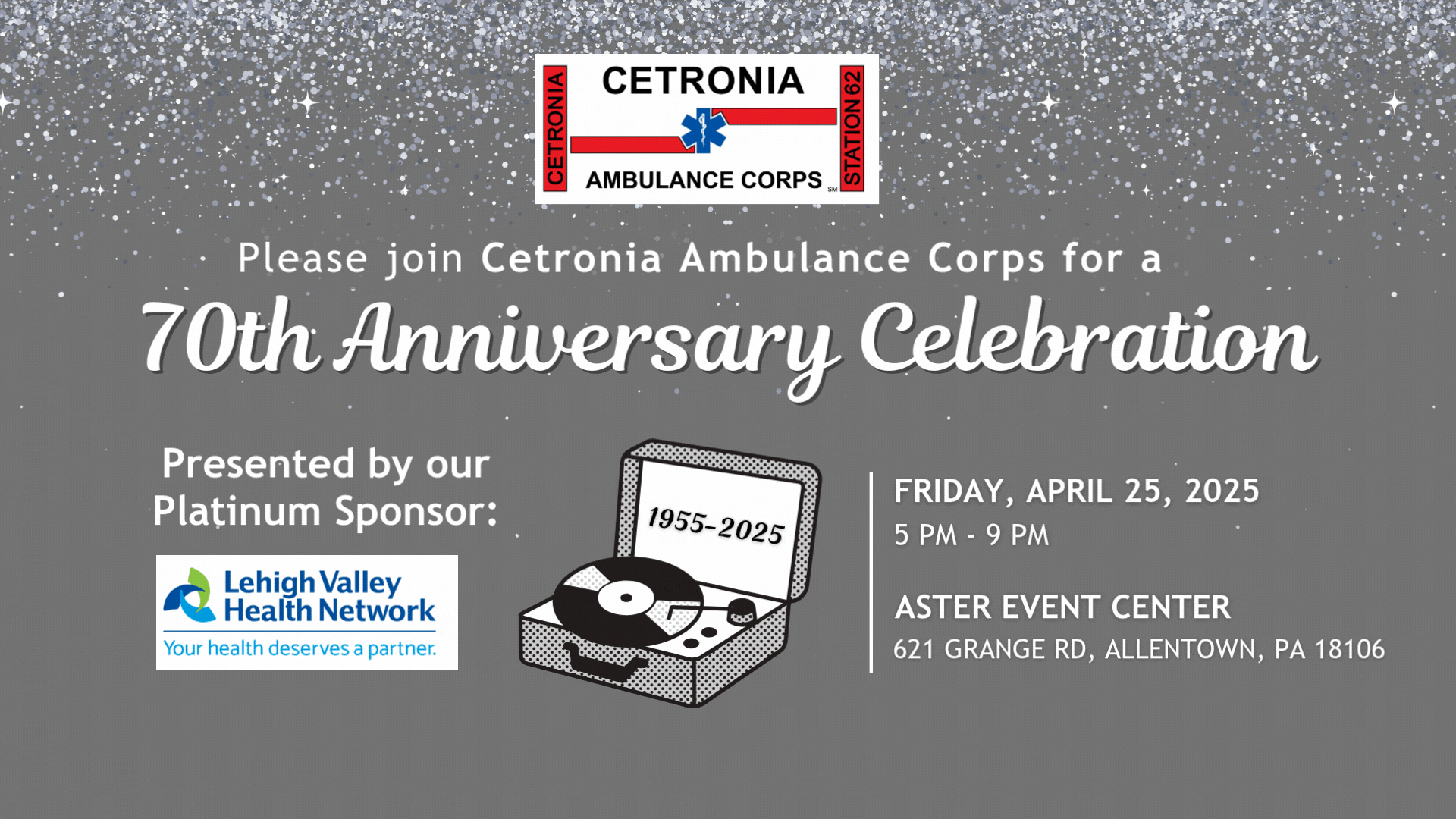 Join us as we celebrate 70 years of service at Cetronia Ambulance Corps' 70th Anniversary Celebration! The event will take place on Friday, April 25, 2025, from 5 to 9 p.m. at the Aster Event Center, located at 621 Grange Road, Allentown, PA 18106. Tickets include one drink, hors d’oeuvres, a buffet-style dinner featuring a carving station, desserts, access to casino games, a raffle, a silent auction, and a wine pull. Guests will also enjoy entertainment from a live DJ and a cash bar.