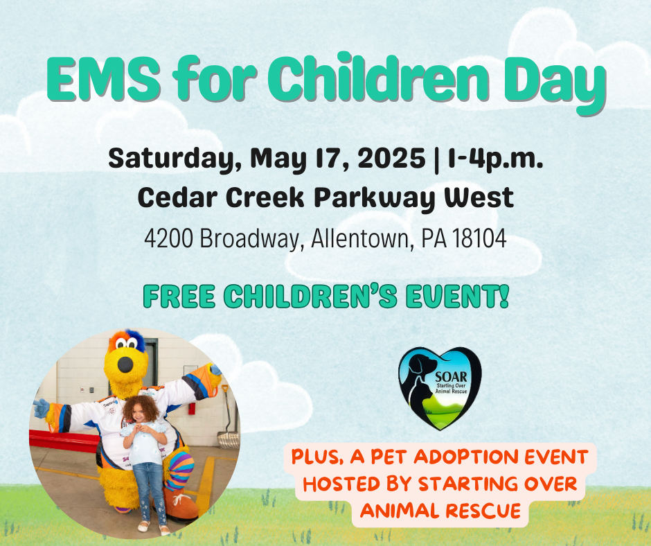 EMS for Children Day is a free community event being held during EMS Week. It is dedicated to celebrating our incredible team while educating children about emergency medical services in a fun and engaging way. Families can explore our ambulances and emergency vehicles, meet Andy the Ambulance, enjoy games and activities, listen to music, and grab food from Take a Taco and Drizzle Ice Cream. This outdoor event takes place at Cedar Creek Parkway West (4200 Broadway, Allentown, PA 18104) and is open to everyone. There is no admission cost. Don’t miss this exciting opportunity to learn more about EMS!