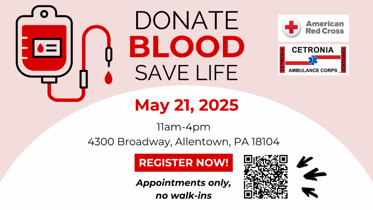 Mark your calendar for May 21st! Cetronia Ambulance Corps is teaming up with the American Red Cross for a blood drive—and we’re inviting you to tour our facility, too! We have 37 appointment slots available, including 3 Power Red donations, and we’d love to fill every one. The drive will be held at our headquarters, 4300 Broadway, Allentown, PA, from 11 AM to 4 PM. Please schedule your appointment using the link provided—no walk-ins accepted.