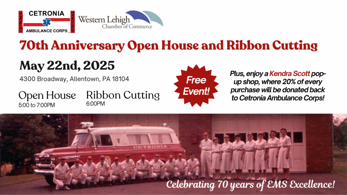 2025 marks Cetronia Ambulance Corps’ 70th year of service, and we’re celebrating this milestone with the Western Lehigh Chamber of Commerce! Join us for a free Open House and Ribbon Cutting on Thursday, May 22, from 5:00 to 7:00 PM. The ribbon cutting ceremony will take place at 6:00 PM sharp.