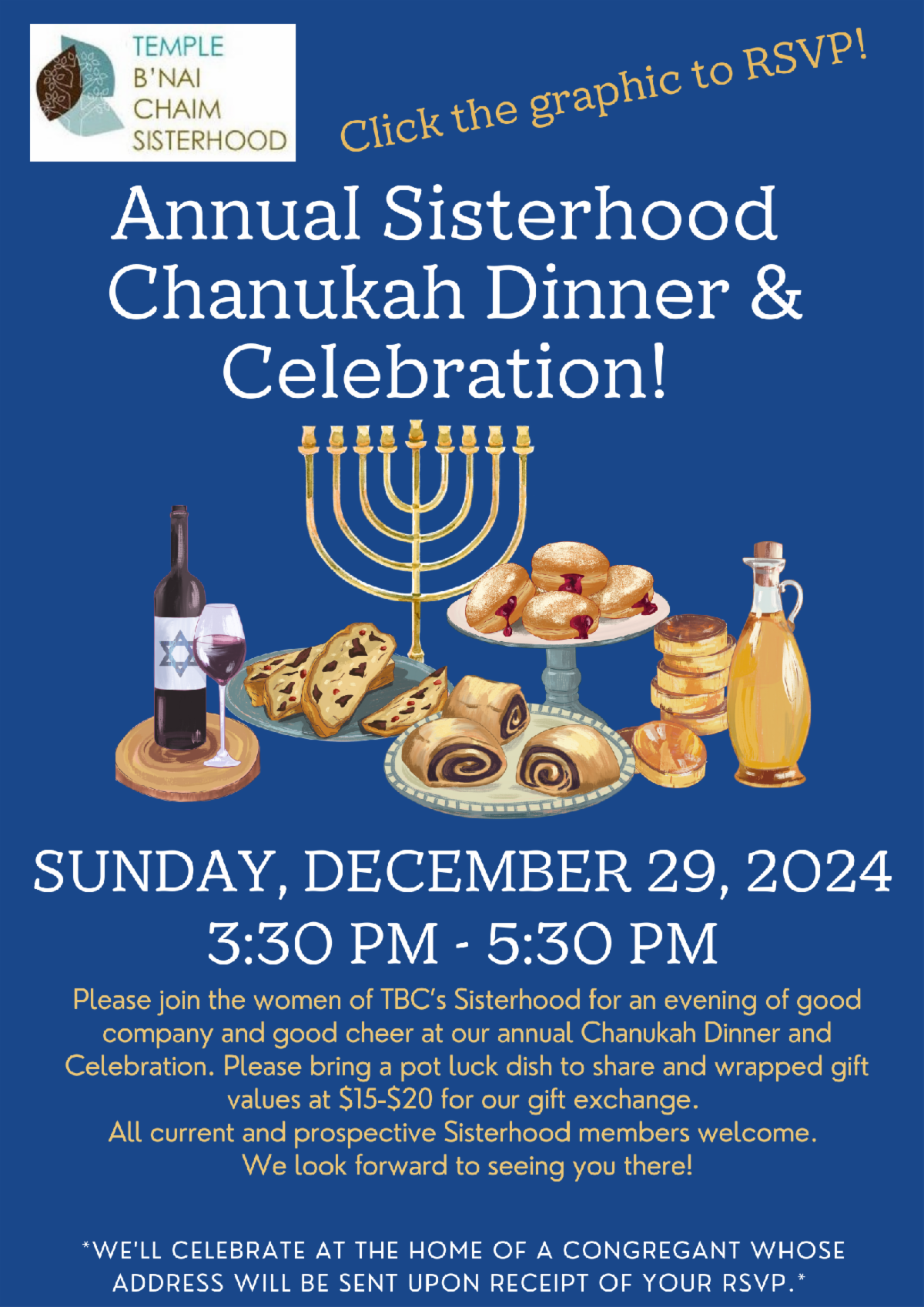 Sunday, December 29, 3:30 pm - Sisterhood Chanukah Dinner & Celebration - See below for details. Click here to RSVP!