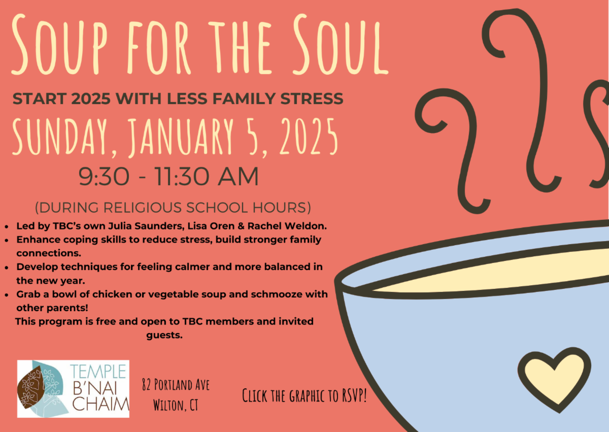 Sunday, January 5, 9:30 am - Adult Education "Soup for the Soul" Wellness Series - Click here to learn all about our presenters - Click here to RSVP.