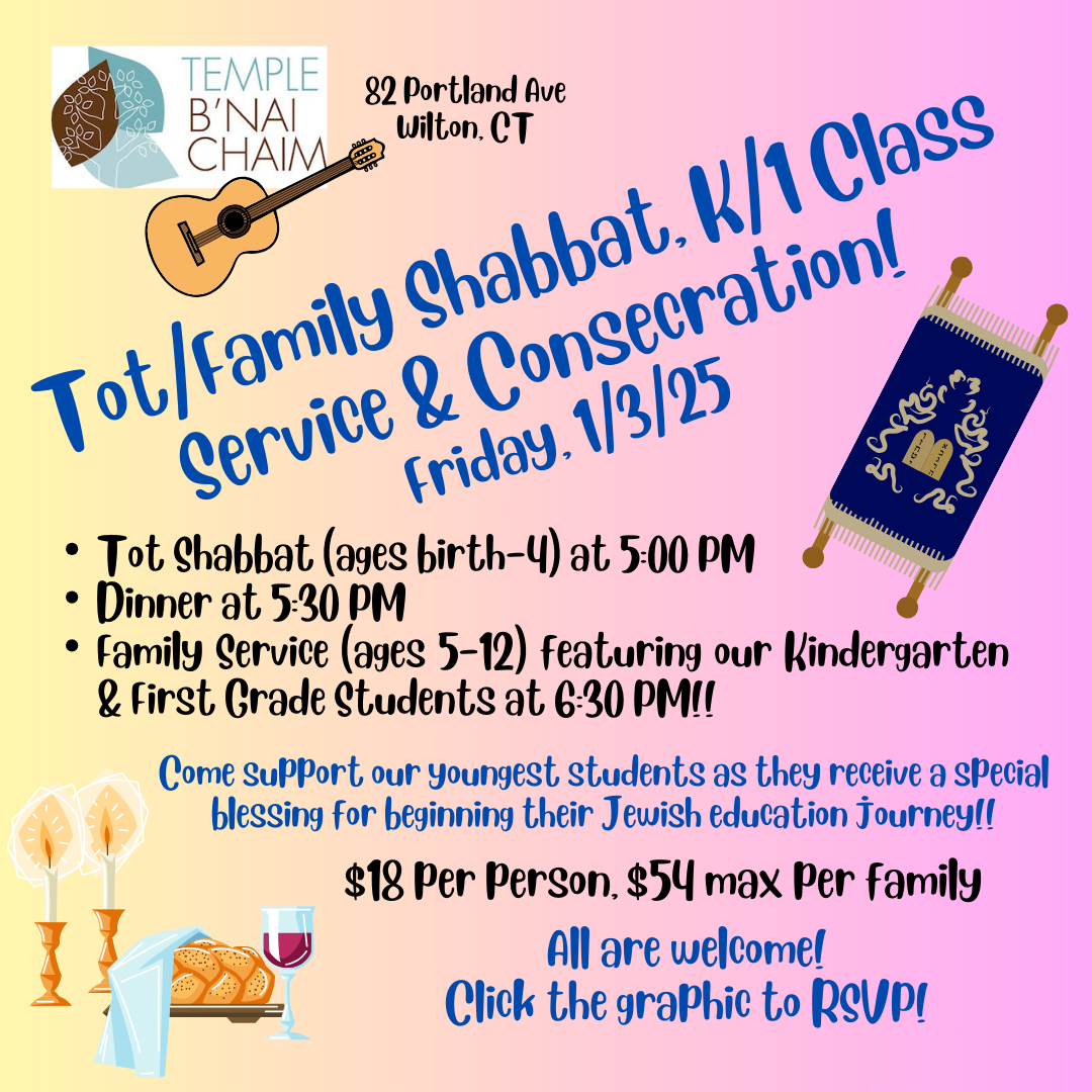 Friday, January 3, 5:00 pm - Tot/Family Shabbat, K/1 Service & Consecration - See below for details. RSVP Required, click here!