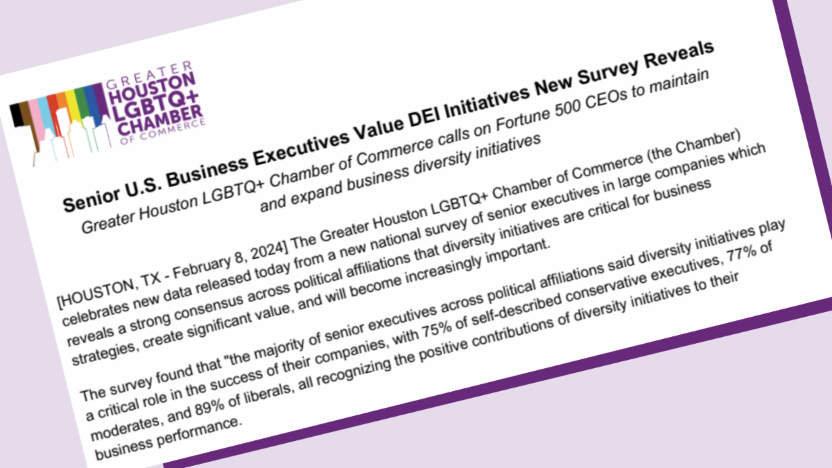 New data was released this month from a national survey of senior executives in large companies which reveals a strong consensus across political affiliations that diversity initiatives are critical for business strategies, create significant value, and will become increasingly important. “The numbers speak volumes – more than 80% of business leaders consider diversity initiatives essential to their business strategy, and the vast majority believe such initiatives will grow in importance in the future," said Tammi Wallace, Co-Founder, President & CEO of the Greater Houston LGBTQ+ Chamber of Commerce.