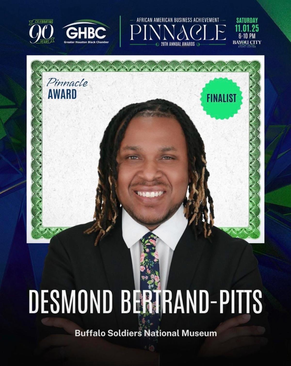 | | Congratulations to Julie Lara, Wellness Operations Leader and PRG Houston Pride Leader, with Chamber Impact Partner, H-E-B, who was recently recognized for her 20 years of service at the company! | | | | Congratulations to Desmond Bertrand-Pitts, with Chamber Member Buffalo Soldiers National Museum, on being named a finalist by the Greater Houston Black Chamber of Commerce for one of their Pinnacle Awards. | | |