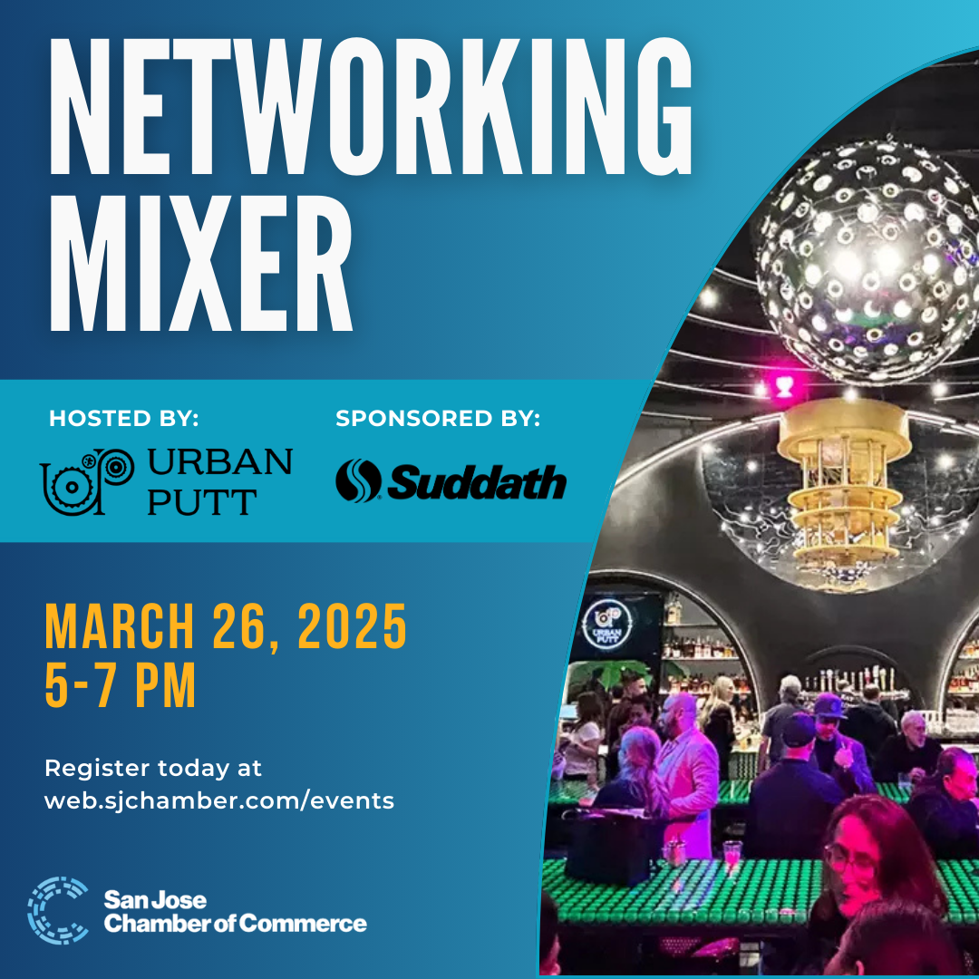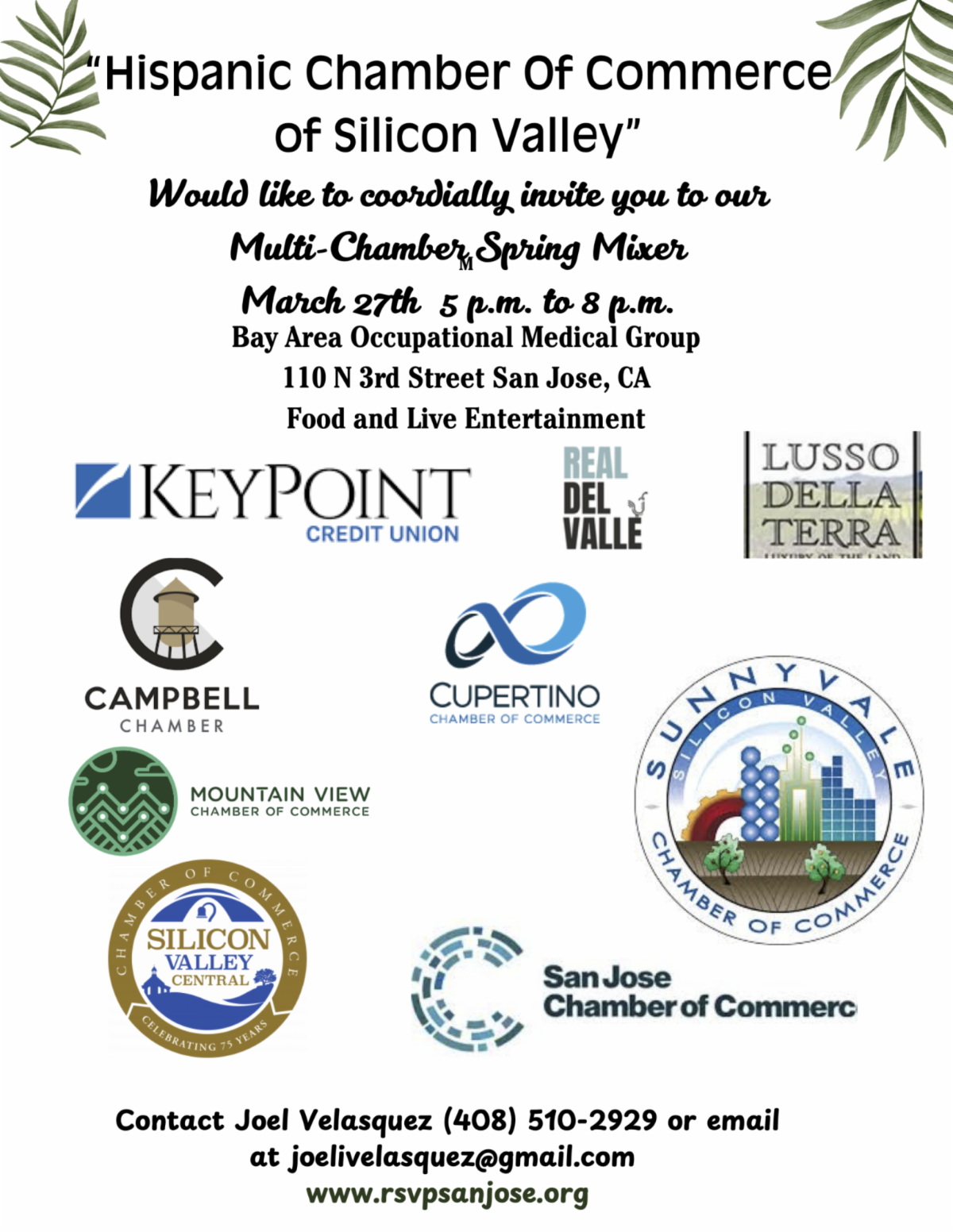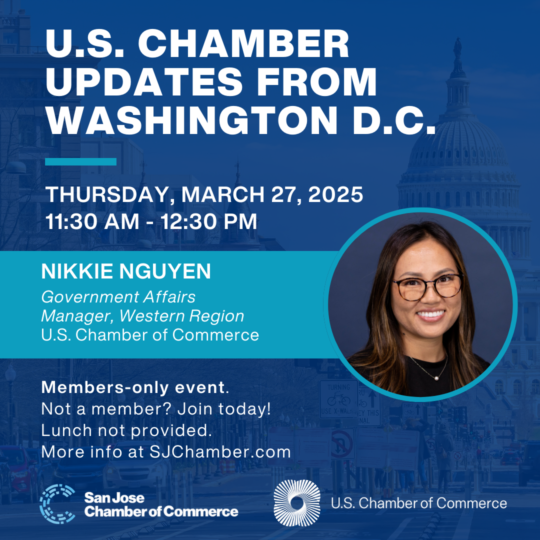 | | 3/27 U.S. Chamber of Commerce Updates from D.C. (Members Only) | | Join us on Thursday, March 27 for a Members-only event to hear updates from the U.S. Chamber of Commerce. Featuring Nikkie Nguyen, Government Affairs Manager, Western Region, this presentation provides timely updates on key legislative and regulatory changes in Washington, D.C., and explores how these developments impact local businesses. It offers valuable insights to help businesses navigate new policies, stay informed on government actions, and adapt to shifting economic landscapes. | | | | | You're invited to a multi-Chamber Mixer hosted by the Hispanic Chamber. Numerous Bay Area Chambers will be participating, including San Jose, Campbell, Cupertino, Sunnyvale, Mountain View, and Silicon Valley Chambers. Food and live entertainment. No advance registration is required. If you have questions, please contact Joel Velasquez at joelivelasquez@gmai.com. | | 3/28 The Future of Downtown San Jose | | |
