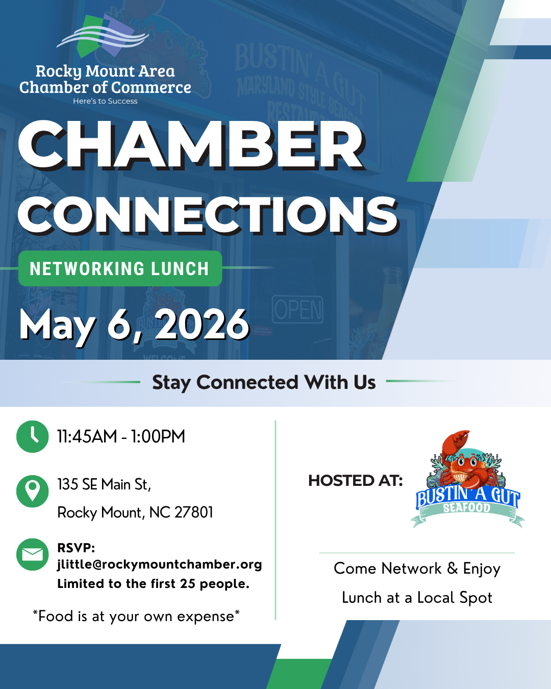Join us for our Chamber Connections lunch on May 6th at Bustin’ A Gut Maryland Style Seafood from 11:45 AM – 1:00 PM, at 135 SE Main St, Rocky Mount, NC 27801.