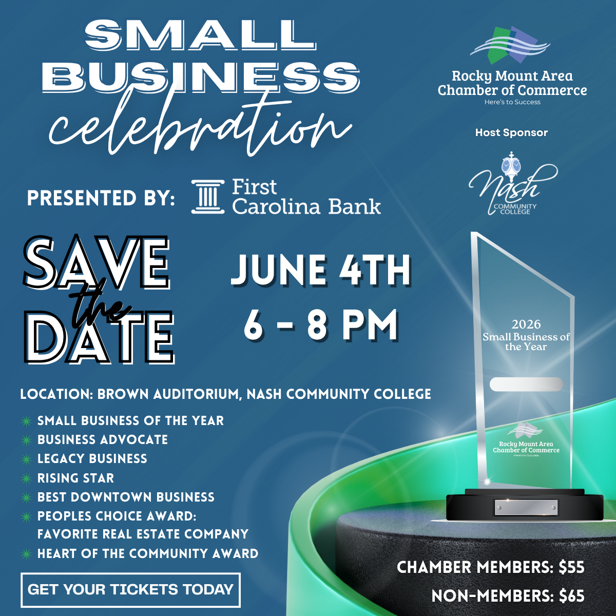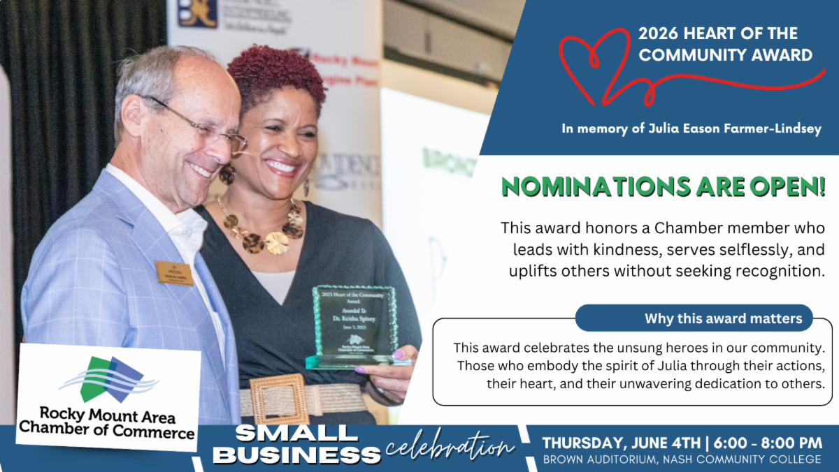 Join us on Thursday, June 4th from 6:00 to 8:00 PM at Brown Auditorium at Nash Community College as we celebrate our small businesses and individuals making a lasting impact in our community. This is truly the networking event of the year bringing together leaders, advocates, and small businesses for an evening of recognition and connection.