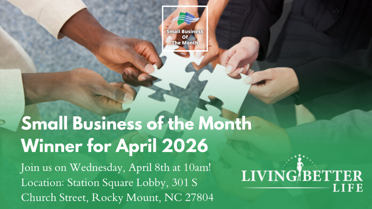 Join us in celebrating Living Better Life, LLC as our Small Business of the Month for April 2026 on Wednesday, April 8th at 10 am at Station Square, 301 S Church Street in the lobby in Rocky Mount, NC.
