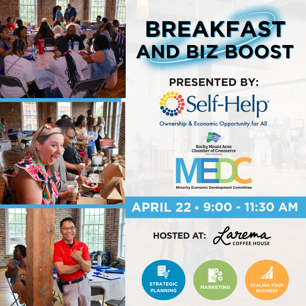Join us on April 22nd at Larema Coffee House from 9:00 to 11:30 AM for a powerful session focused on strategic planning, marketing, and scaling your business. Connect with fellow professionals and walk away with tools to grow.