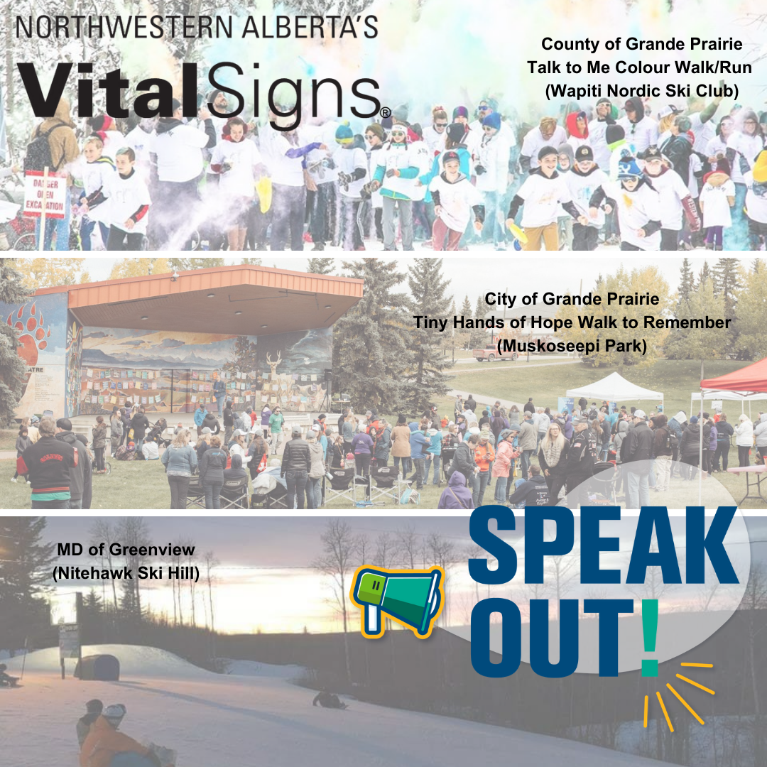 Northwestern Alberta’s Vital Signs® provides a snapshot of quality of life in the City of Grande Prairie, the County of Grande Prairie, the MD of Greenview and local communities. This knowledge-driven tool uses research to highlight where our strengths are as communities and where the gaps lie. Vital Signs invites every citizen and leader to identify priorities, start conversations, and make informed decisions to drive positive change, where no one is left behind.
