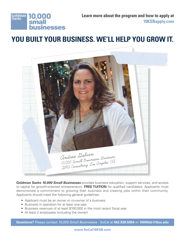 The Goldman Sachs 10,000 Small Businesses is a FREE-tuition program for qualified small business owners who are interested in growing the business and adding jobs to their communities. This practical 13 week program (one day per week) examines business fundamentals through the lens of actual business experiences, provides you with one-on-one business advisory services, and helps you develop and implement a business growth plan tailored to your own business. Plus, 85% of our graduates do business with each other!