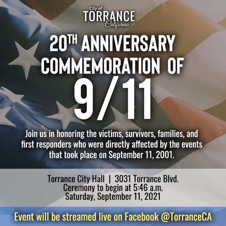 Torrance, Calif., August 31, 2021 – The City of Torrance invites the community to commemorate the 20th Anniversary of 9/11 on Saturday, September 11 at 5:46 a.m. in front of Torrance City Hall, 3031 Torrance Blvd. During this ceremony, victims, survivors, families, and first responders directly affected by the terrorist attacks will be honored.
