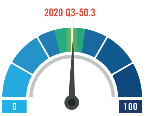 The current Small Business Index score is 50.3 (an increase from 39.5 in Q2). However, this is still substantially below findings before the pandemic: the Index score was 71.7 in Q1 of 2020, based on data collected before the full economic impact of the coronavirus became apparent.