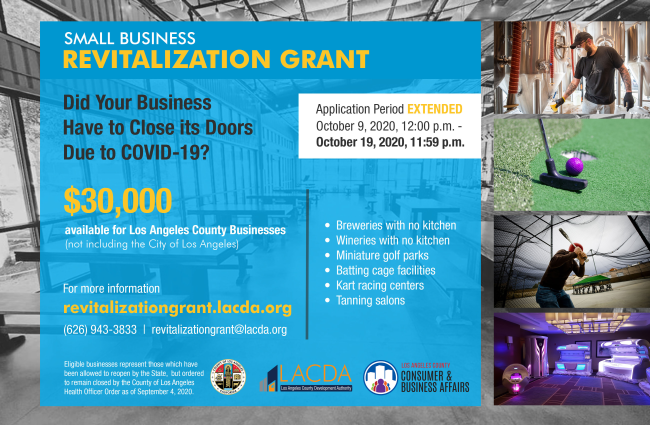 The LACDA has launched the Small Business Revitalization Grant Program targeted to the following businesses listed below that must be located in LA County but outside of City of Los Angeles. Businesses in the City of Los Angeles are not eligible. Grants are $30,000. This program has been extended to today Monday, October 19, 2020 at 11:59 PM Learn more here.