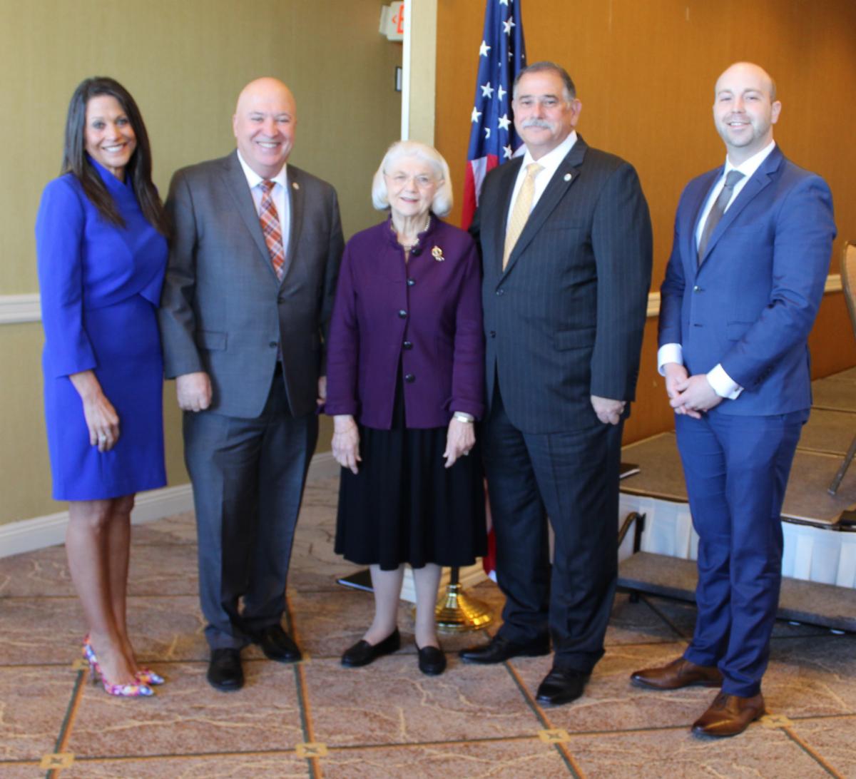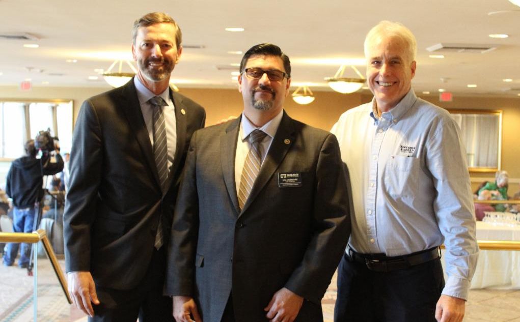 The Torrance Area Chamber of Commerce's immediate past chair John Heffernan, AT&T, current chair Dan Armendariz, California Water Service Company, and incoming chair Kirk Rossberg, Torrance Bakery, pose for a photo together at the Torrance City Council Candidates Forum, held yesterday, January 29th.