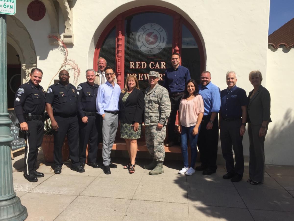 Colonel Thomas Rock Jr., (center) Space and Missile Systems Center, LA AFB is welcomed by members of the Torrance Police Department, Rob Van Lingen, Kirk Rossberg, Brandon Matson, Donna Duperron, Laurie Brandt and Bob Brandt in 2016. This gathering was the result of the Honorary Commander Program at LA AFB.