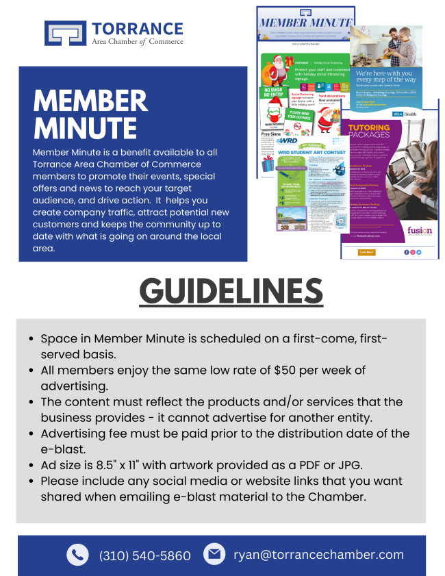 Member Minute is a benefit offered to Torrance Area Chamber of Commerce members. It is a weekly e-blast to over 5,000 people where you can promote your company events, special offers, and news. Member Minute helps create traffic, attract potential new customers, and keeps the community up to date with what is going on in the local area.
