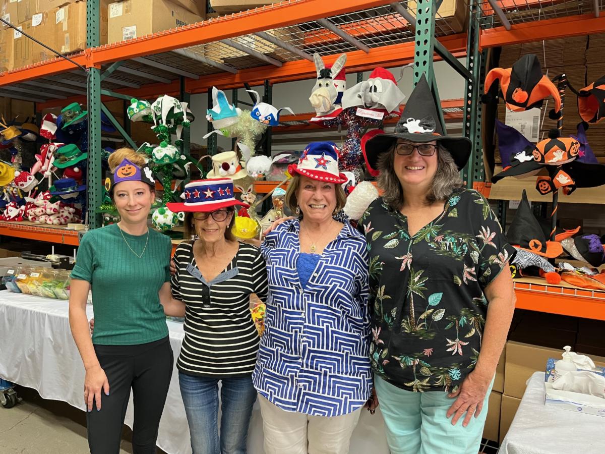 Happy Hats for Kids staff proudly wear a sampling of hats created for kids in hospitals.