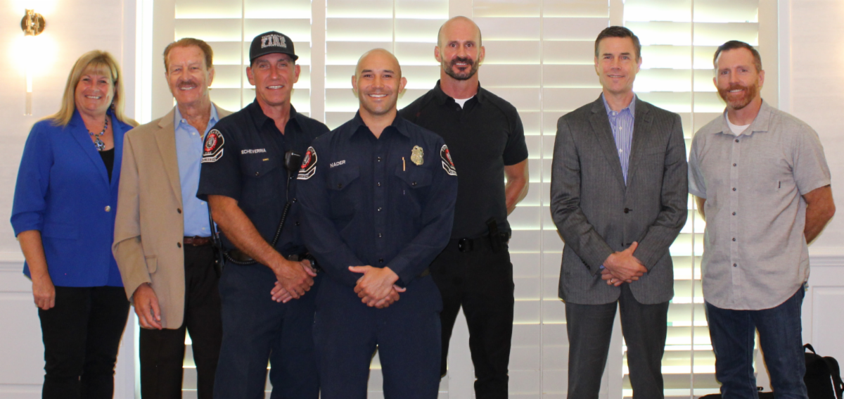 (Left to right) Donna Duperron, President & CEO, Torrance Area Chamber of Commerce, John Schoen, Advertising & Marketing Network, Alex Echeverria, Torrance Fire Fighter, Christopher Nader, Torrance Fire Fighter, Ryan Peterson, Torrance Police Sergeant, Eric Walli, American Honda Motor Company, Inc., Mark Ponegalek, Torrance Police Sergeant.