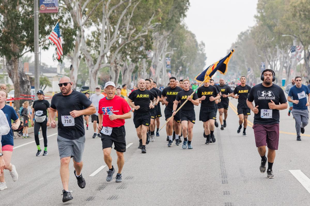City of Torrance Mayor, George Chen (red shirt), runs alongside Armed Forces at the 2023 5K For Freedom Run/Walk. | |